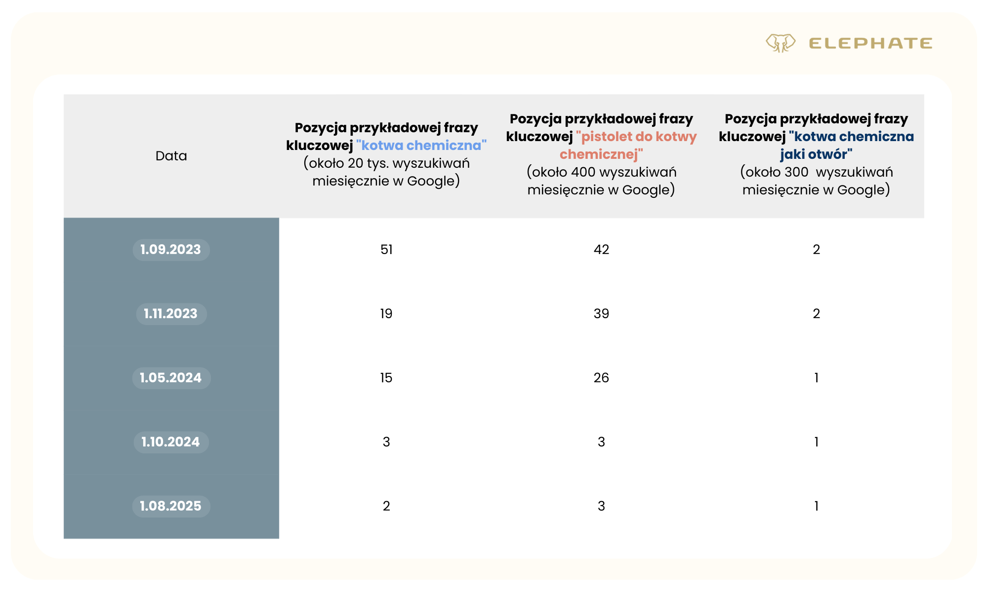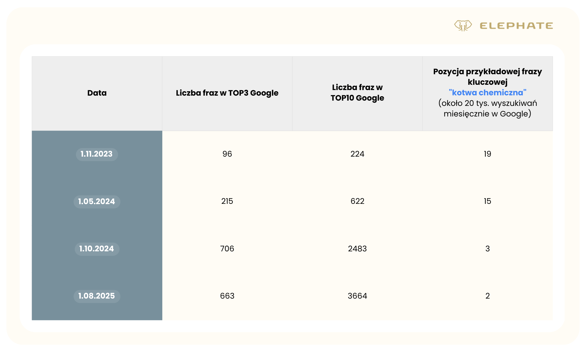 W pierwszej fazie współpracy wspólnie wypracowaliśmy strategię skoncentrowaną na segmencie kotew chemicznych. Działania obejmowały optymalizację kategorii produktowych, wdrożenie przemyślanego linkowania wewnętrznego oraz rozwój eksperckich treści budujących autorytet domeny.